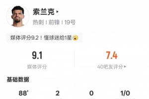 体育资讯2月2日讯 英超第24轮焦点战,热刺主场迎战曼城。索兰克先发出战,贡献双响,另外他还有2次过人成功,送出1次关键传球,评分9.1。