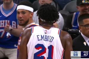 恩比德摊手耸肩抱怨布克犯规!后者呛声后直接离场:全是球尼格!