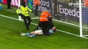 【哈宝:我不干净了😭】曼城打入第三球后,一名球迷冲进球场对躺在地上的哈兰德又抱又亲,随后被保安人员拉离球场。这粒进球后来被判无效。