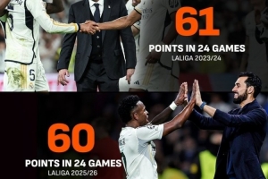 本赛季,皇马在西甲24轮后拿到了60分,创造队史第三高的24轮后积分。