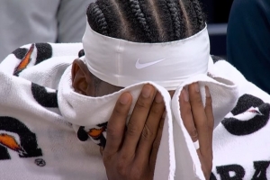 雷霆老传统了!队记赛后采访卡鲁索遭哈滕整蛊 发带变“绷带”