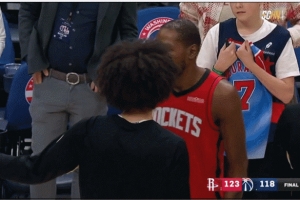 赛后,杜兰特在场边指导奇才的年轻前锋凯肖恩·乔治。