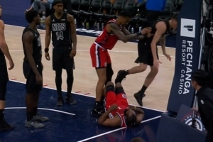 杰明保护哈登落地 科林斯误会了 直接给杰明推飞引发冲突