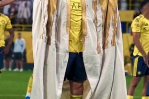 下一篇: 特殊装扮!沙特建国日,C罗带队取胜后身着沙特传统金色长袍谢场